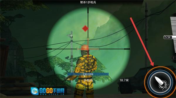 3、把瞄准镜的准星对准目标步枪兵,点击右下角的射击按钮,即可完成对该目标的击杀。