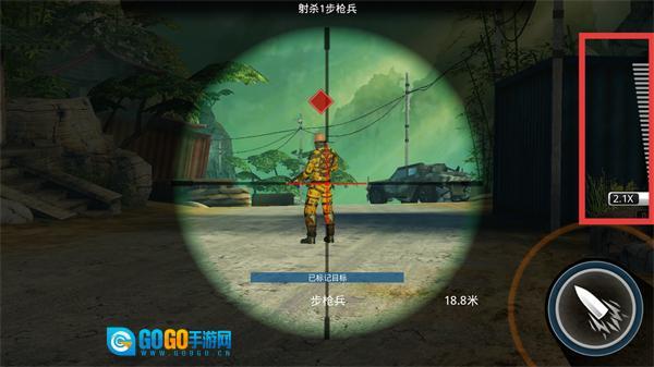 进入对局后,使用瞄准镜锁定目标步枪兵,可通过调整右侧的倍率来放大视野,以更方便瞄准。