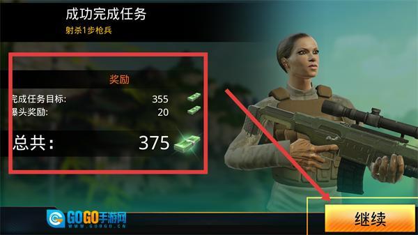 4、完成击杀操作后,耐心等待任务结算界面加载出来。在查看完所获得的奖励后,点击继续按钮,即可返回至主界面。