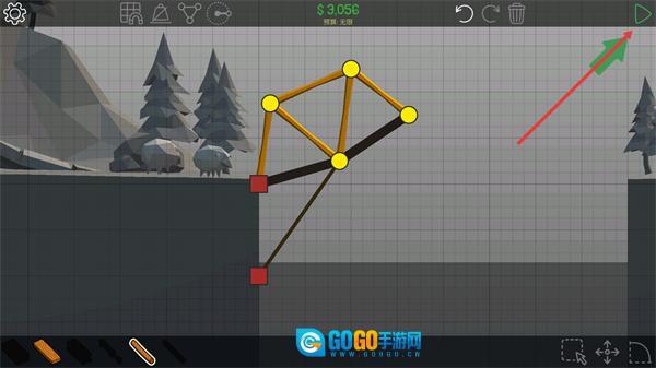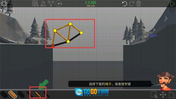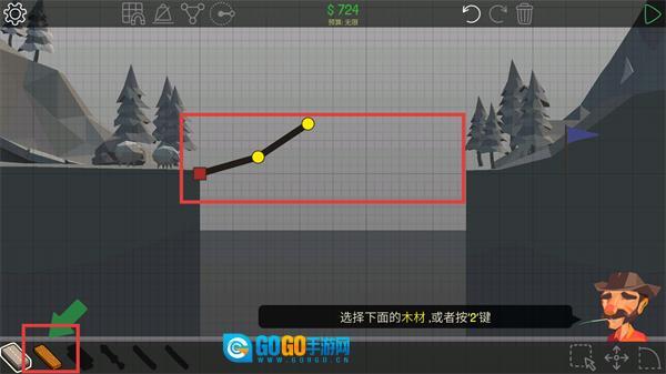 1、按照提示选择【木材】,在缺口位置搭建初始支撑结构,要保证连接牢固且满足预算要求。