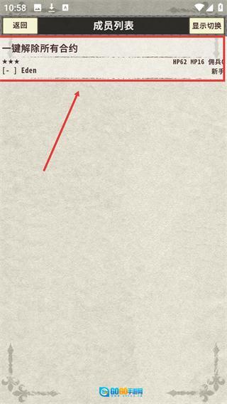 1、查看【成员列表】里【Eden】的【HP62】【MP16】状态,核实合约情况,对佣兵进行管理来优化队伍配置,增强战斗能力。