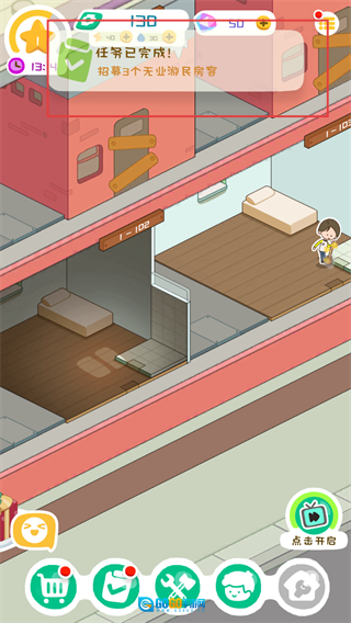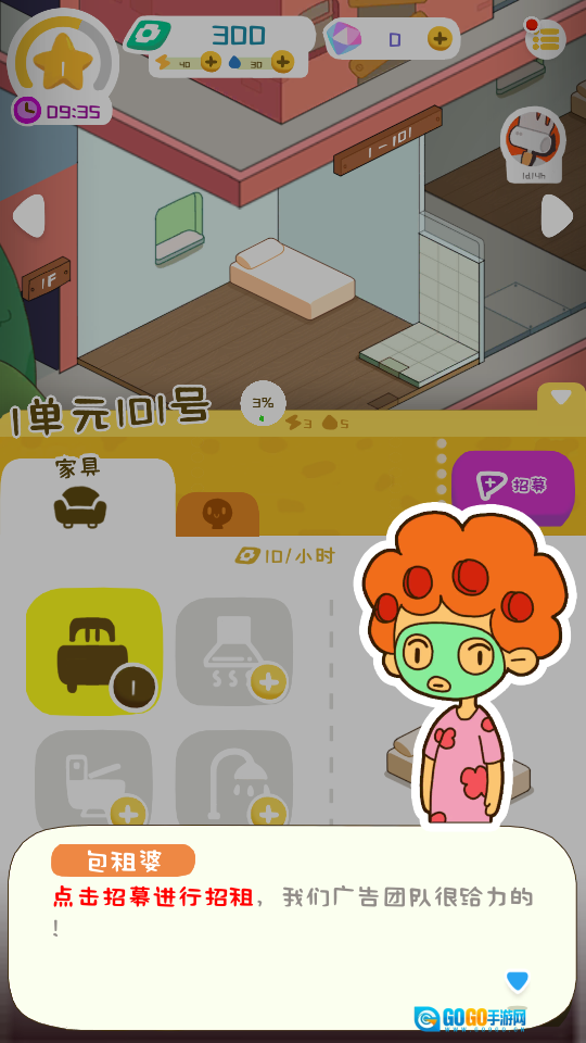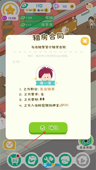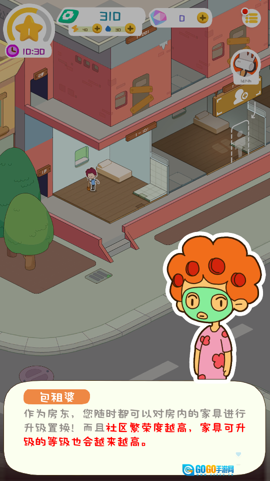 刚进入游戏时,按照【包租婆】的引导去熟悉房产打理的相关任务,留意屏幕上方显示的像300这样的资源数值,对其进行合理的规划与使用。