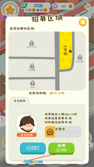 1、在【招募区域】选定租客(例如无业游民这类群体),点击【招募】按钮发出邀约,就能享受每小时租金增加50的福利。