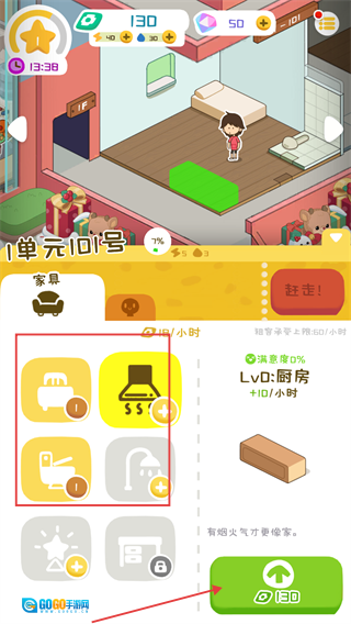 4、进入【单元101号】界面后,挑选【厨房】这类家具,点击对应的按钮消耗资源,即可解锁并布置房间。