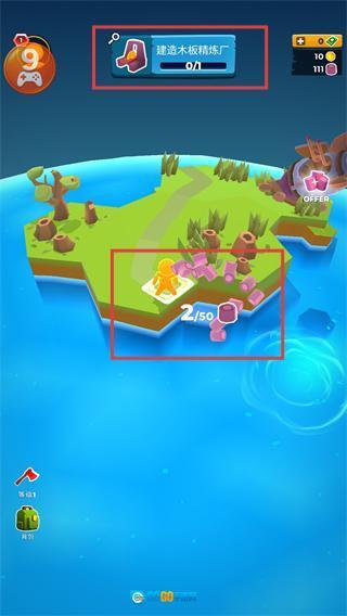 3、在【建造木板精炼厂】的任务区域内,收集所需材料,直至进度达到【2/50】,以此逐步满足建造该设施的条件。