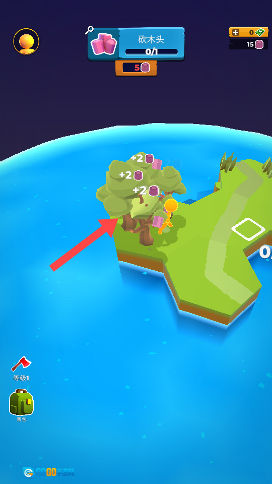进入游戏后,首先查看【砍木头】任务,然后操控角色在岛上寻找树木,通过砍伐来收集资源。