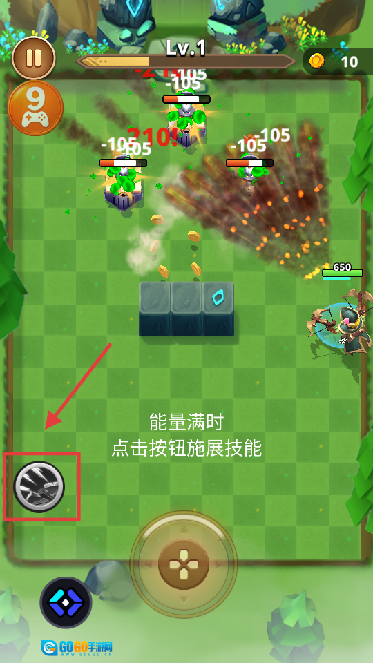 4、当【能量】积累完毕后,点击左下角的【技能按钮】释放技能,能够快速清理怪物或者对敌人造成高额伤害。