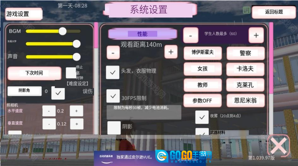 7、在游戏中还可以设置系统,比如学生数最多60人,观看距离140m等等之类的