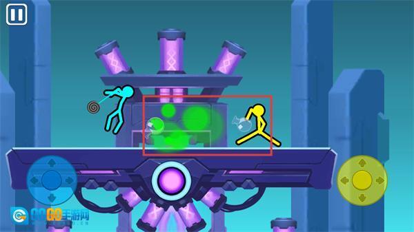 3、借助场景里的机关(比如紫色装置),避开敌方黄色火柴人的攻击,同时抓住合适的时机展开进攻。
