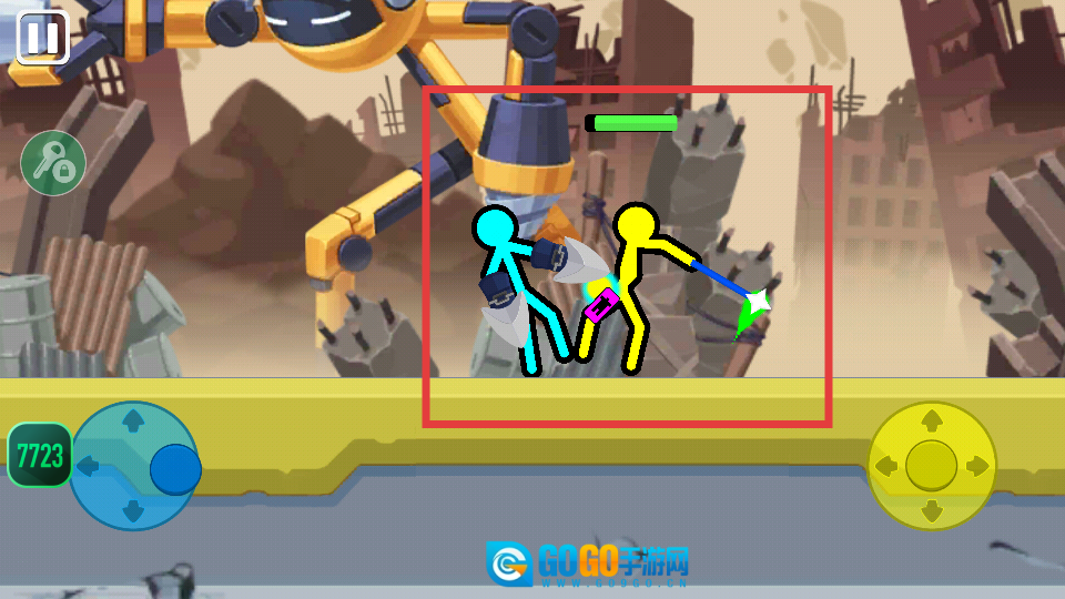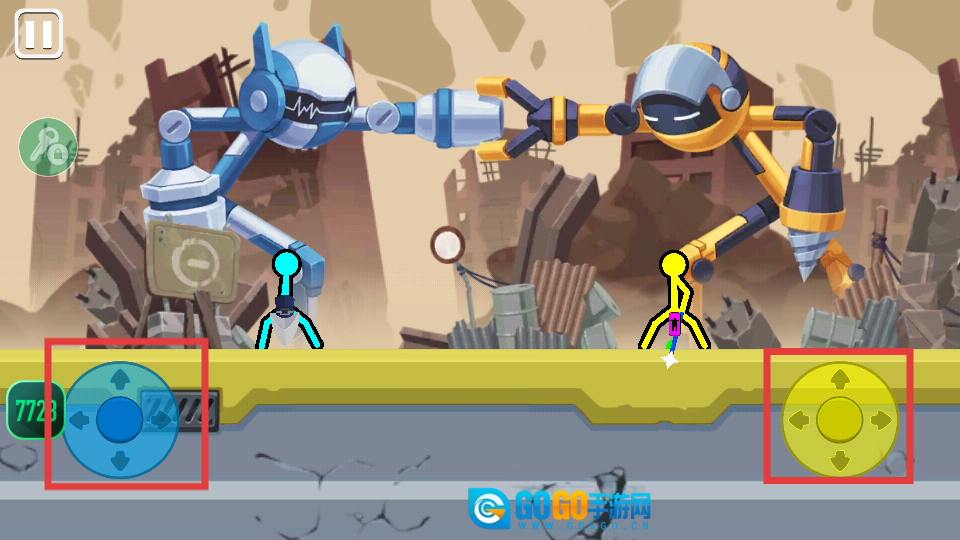 2、进入战斗场景后,可点击左侧红框中的蓝色方向按钮,以及右侧红框里的黄色方向按钮,以此来操控火柴人进行移动。
