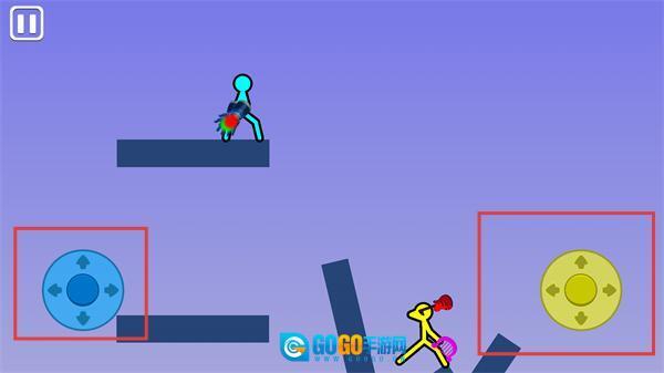 2、通过左侧的【蓝色方向键】来操控蓝色火柴人的移动,借助右侧的【黄色功能键】来施展攻击技能。