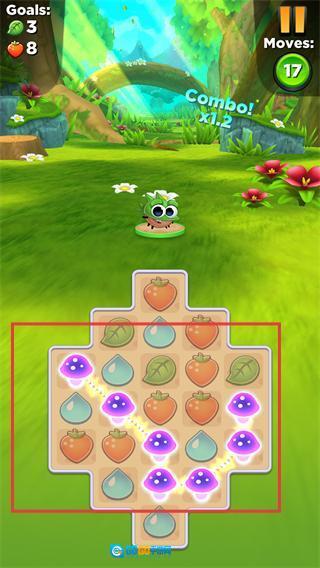 2、触发【Combox12】的连击效果,消除蘑菇图案后,目标剩余数量变为3,剩余步数则减少至17步。