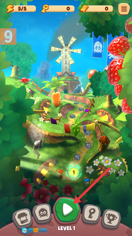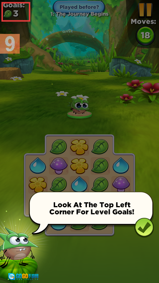 当前关卡的目标是消除8个草莓,还剩18步可以使用。你可以拖动绿叶等图案来完成消除操作,以此推动目标的完成进度。