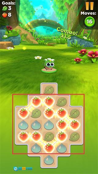 3、通过消除操作制造出大量草莓图案,以此触发【Combox15】的连击效果,从而更接近目标,目前还剩16步可操作。