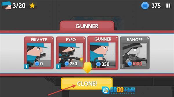 1、在单位界面选定“GUNNER”后,点击“CLONE!”按钮来克隆更多炮手,目前已集齐3/20个单位,正持续扩充作战队伍。