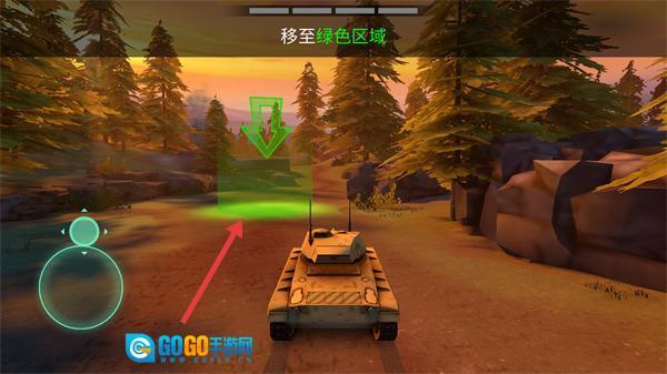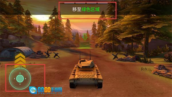 1、进入关卡后,按照“移至绿色区域”的提示,借助左侧摇杆操控坦克移动,朝着画面里的绿色目标区域行进。