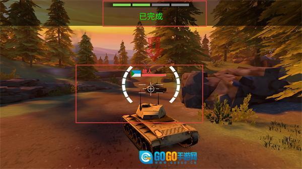 3、进入绿色区域后,任务提示会更新为“已完成”,与此同时敌军坦克将出现,界面上会显示敌方的血量条,此时需准备发起攻击。