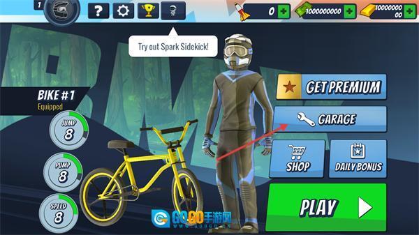 1、在初始界面点击【GARAGE】按钮进入车库,能查看已装配的【BIKE#1】以及各类道具。