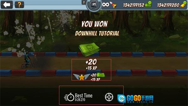 4、完成关卡后,可领取奖励并查看最佳通关时间,这些奖励和时间数据将用于后续的自行车升级以及新赛道解锁,从而帮助提升竞速表现。