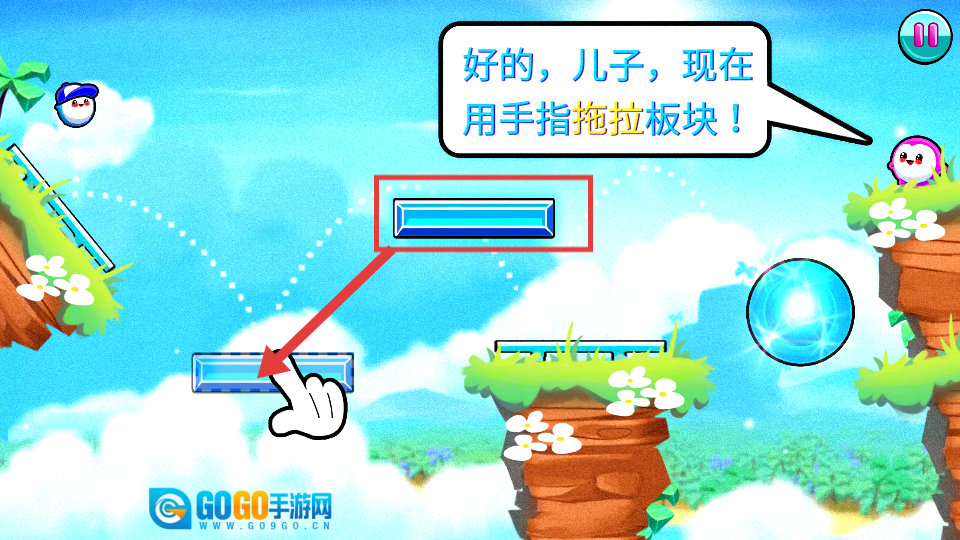 2、根据提示【用手指拖拽板块】,将蓝色板块拖动到合适的位置,以此搭建角色跳跃的路径。