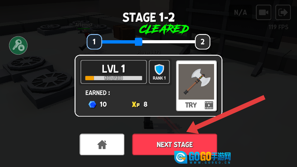 4、战斗胜利后,在结算界面点击【NEXT-STAGE】按钮,即可进入下一个关卡继续挑战。