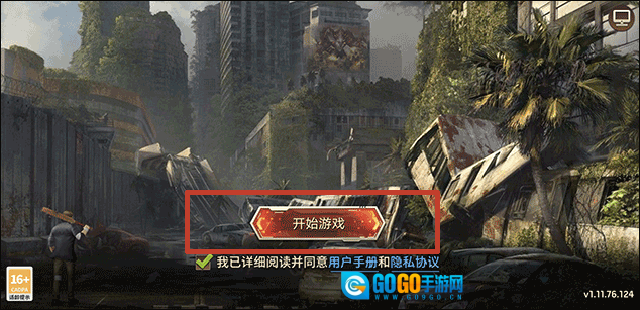 1、在这款游戏的标题界面,先勾选“我已详细阅读并同意用户手册和隐私协议”,然后找到并点击“开始游戏”选项;