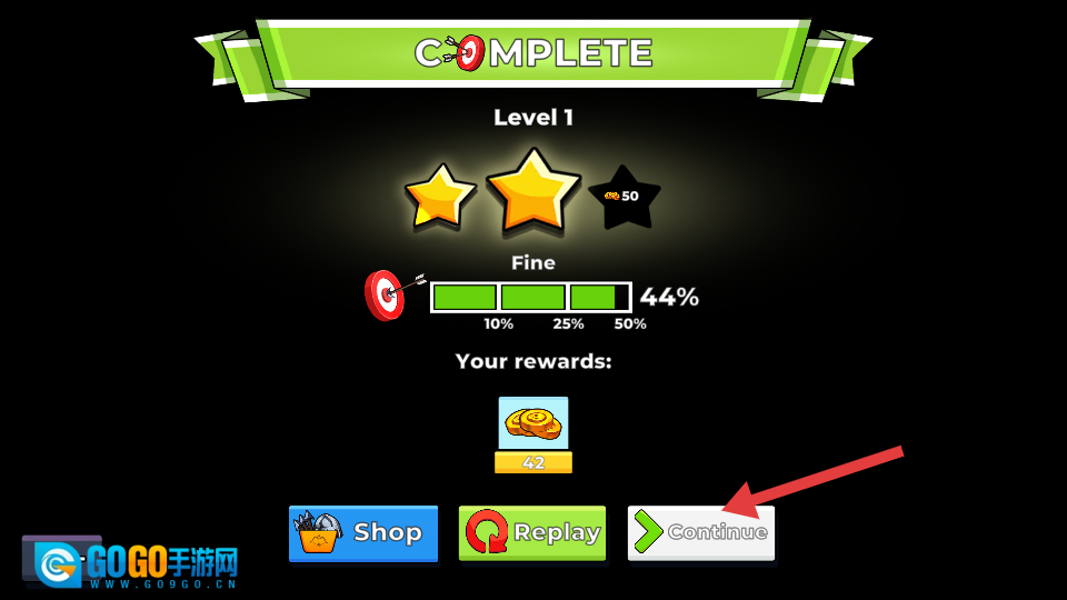 4、关卡完成后点击【Continue】,继续挑战下一关。