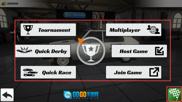 2、进入赛事界面后,可选择【Tournament】(锦标赛)、【QuickRace】(快速竞赛)等模式,选定模式后点击【方格旗】图标即可进入比赛环节。
