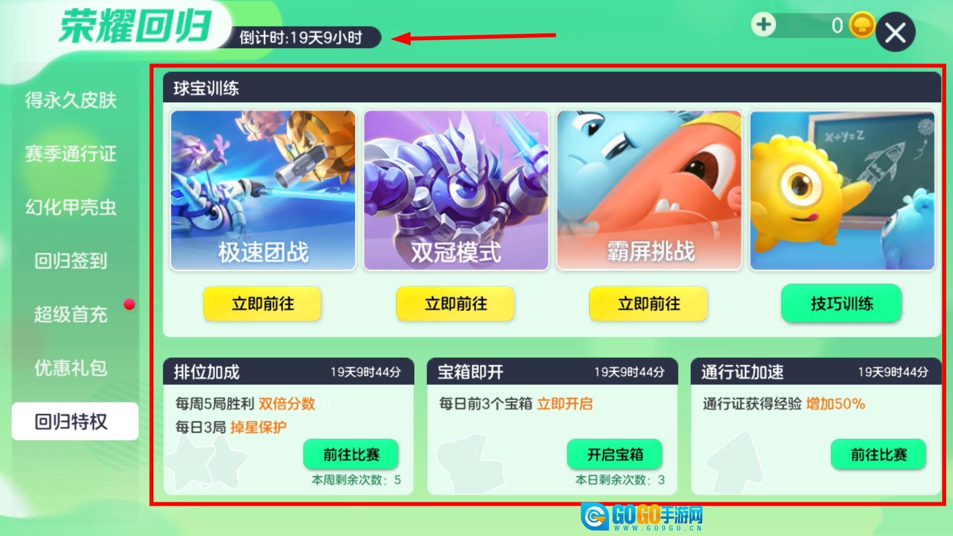 1、回归后可参与【极速团战】【双冠模式】等玩法,完成排位加成任务获取双倍分数与掉星保护,提升游戏进度。