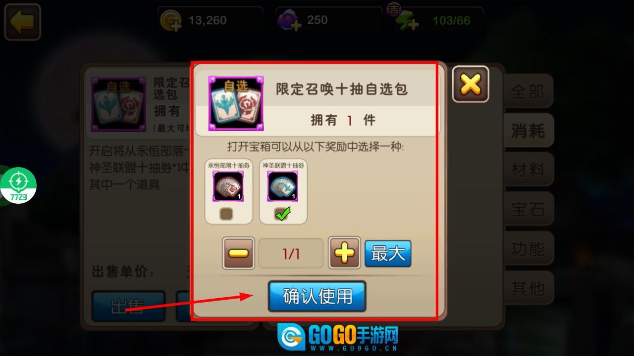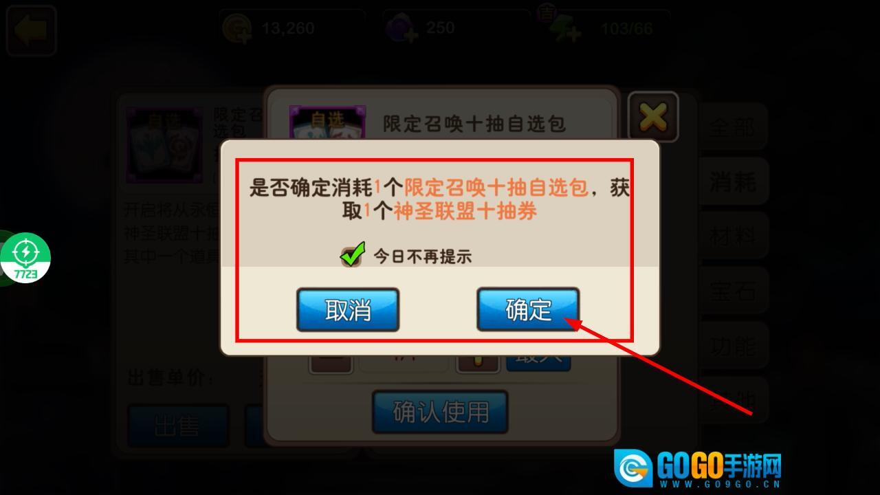 3、弹出消耗确认提示框时,确认召唤券类型,点击【确定】按钮完成自选包的消耗操作。