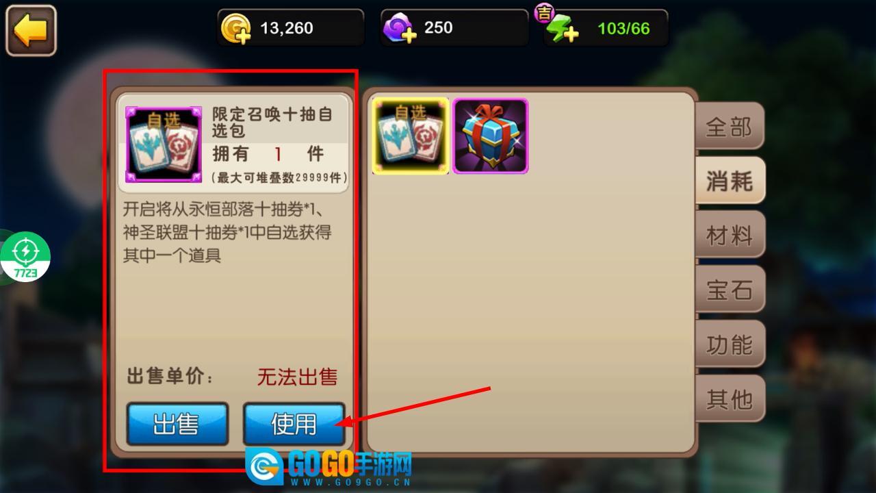 1、找到背包中的【限定召唤十抽自选包】,查看其自选召唤券的说明后,点击界面的【使用】按钮开启选择流程。