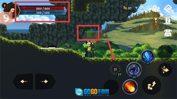 1、角色等级达【7】级,血量回满至【660/660】,击败敌人后获得【+400】奖励,准备切换场景。