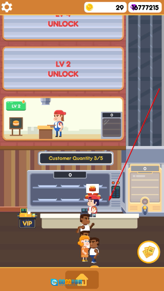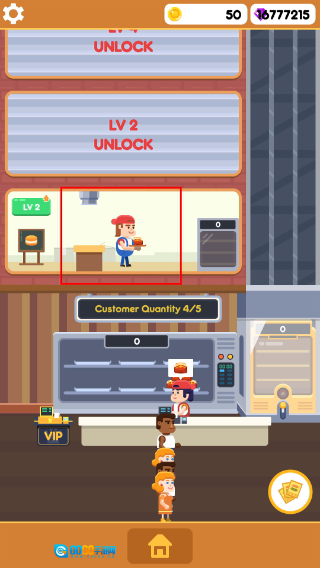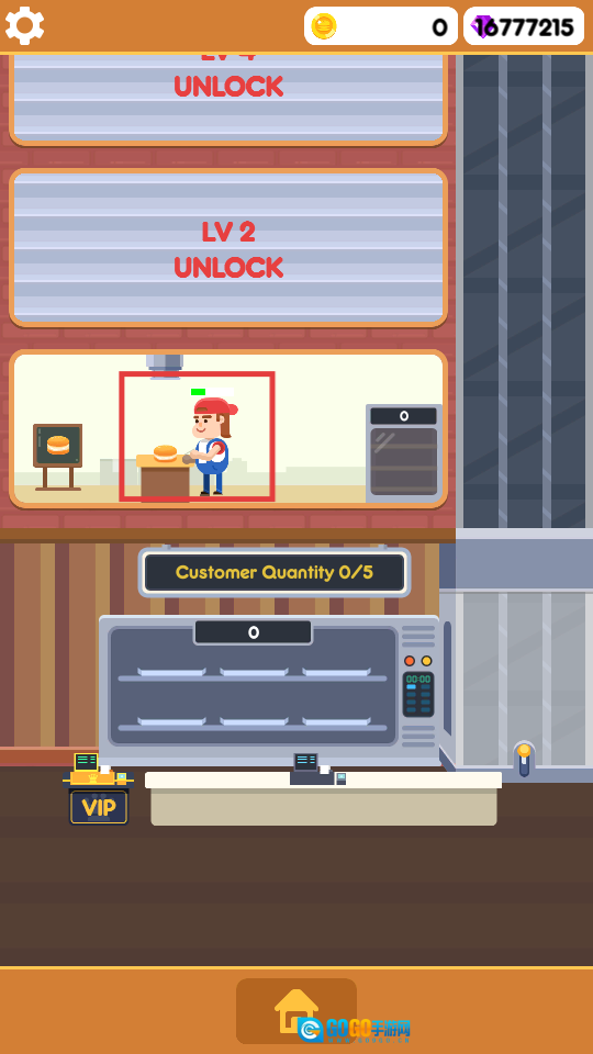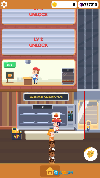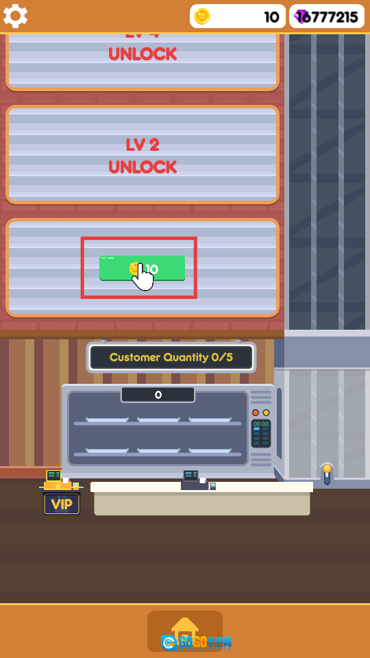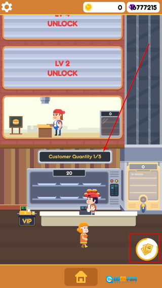 1、游戏开局时点击【金币】图标来积累资源,解锁【UNLOCK】功能,逐步增加【CustomerQuantity】的容量,为之后的运营奠定基础。