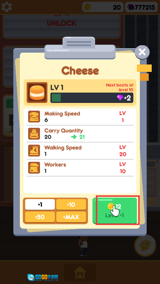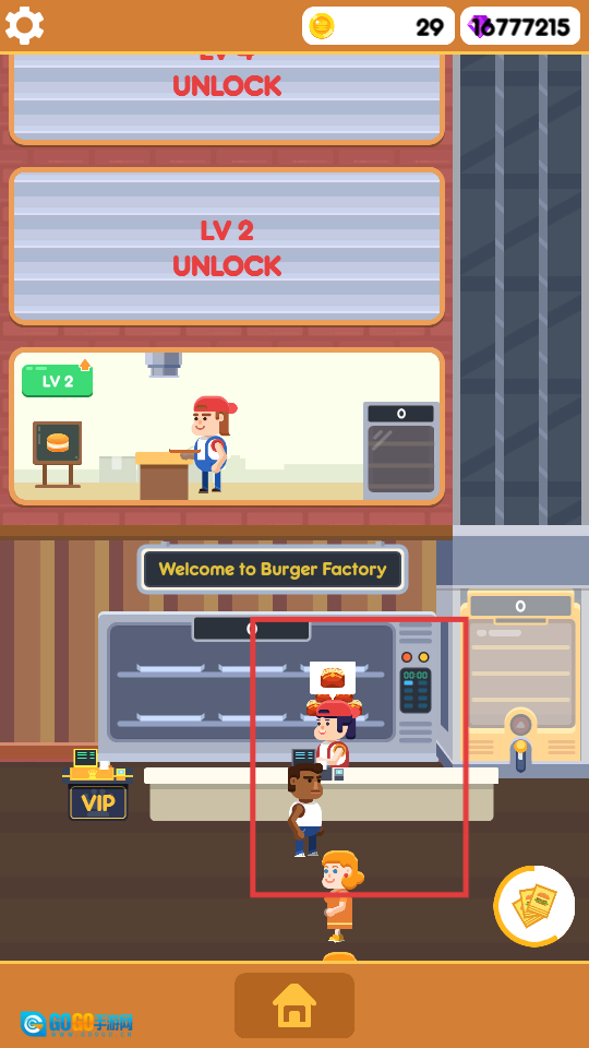 1、点击界面上标有【10】的绿色按钮,解锁负责制作汉堡的员工。
