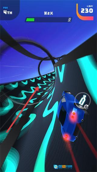 3、在螺旋赛道段,跟随箭头调整赛车行驶轨迹,躲避赛道障碍的同时保持超车节奏,排名提升至【4TH】。