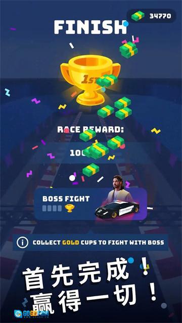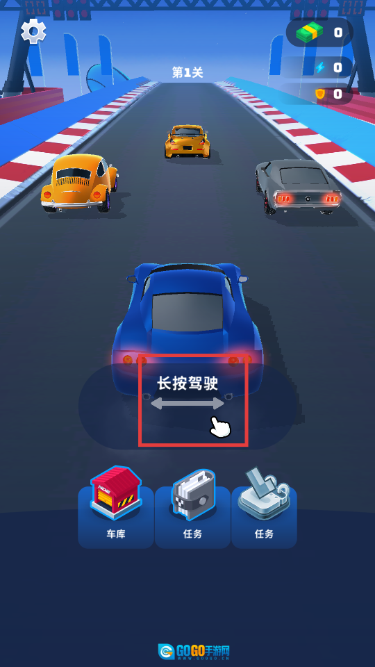1、在【第1关】,长按屏幕控制车辆行驶,参与赛车比赛。