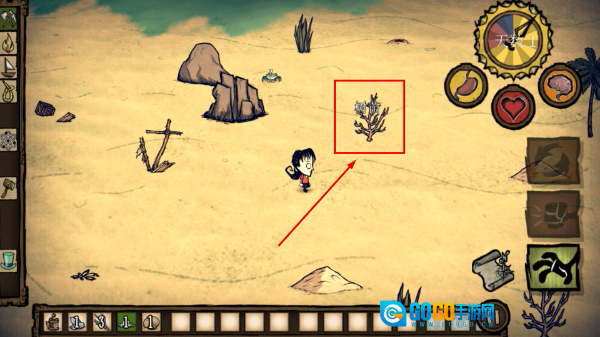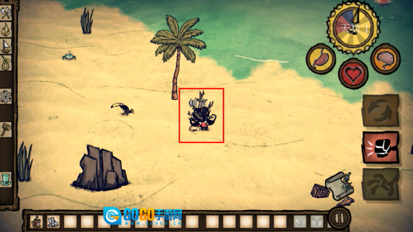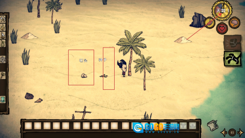 4、靠近岩石、贝壳堆,挖掘收集资源,丰富物资库,为建造、生存做准备。