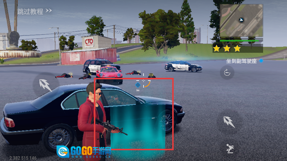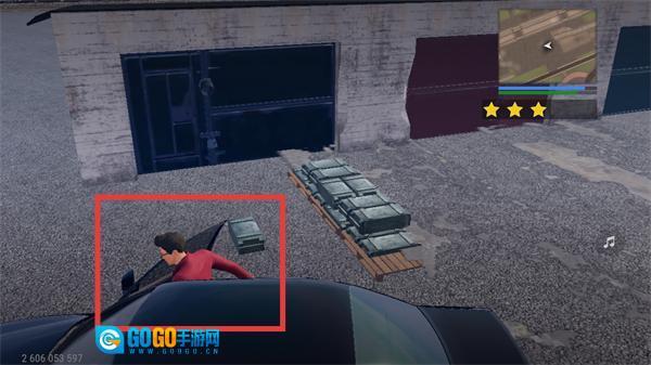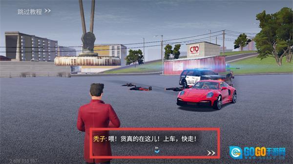 3、收到【秃子:喂!货真的在这儿!上车,快走!】提示后,操控角色移动至【红色车辆】旁,准备进入载具。