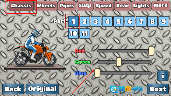 4、拖动【Red】【Green】【Blue】滑块,调整摩托车涂装颜色,完成后可进入下一个设置阶段。