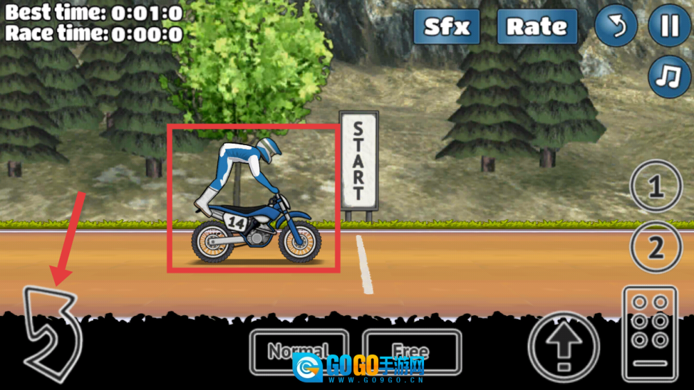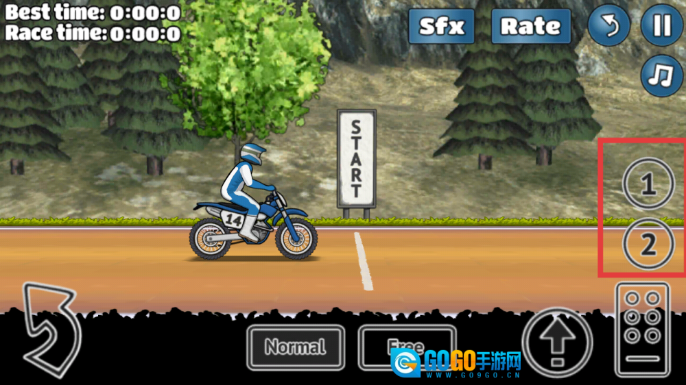 2、进入游戏后,利用右侧红框内的【1】【2】按钮,进行更改骑车姿势。