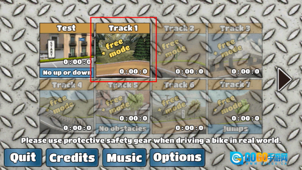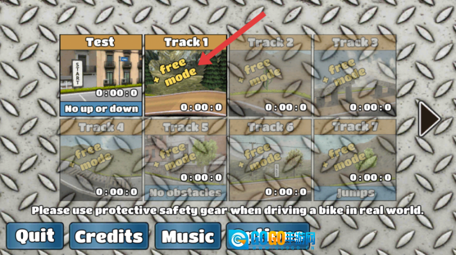 1、在关卡选择界面,点击箭头所指带有【free+mode】标识的【Track-1】,开启自由模式关卡。