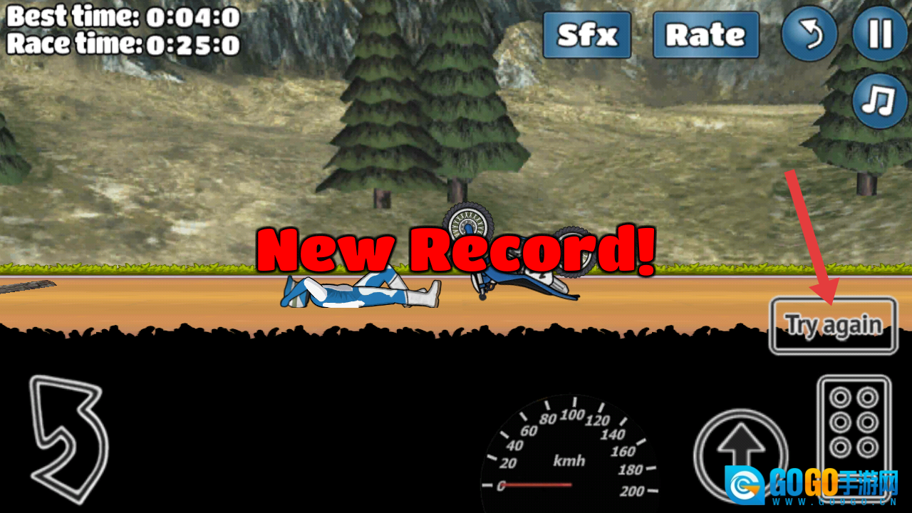4、若骑行失败,看到【New-Record】提示后,点击【Try-again】按钮,重新开始挑战。