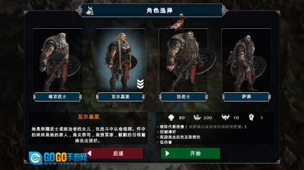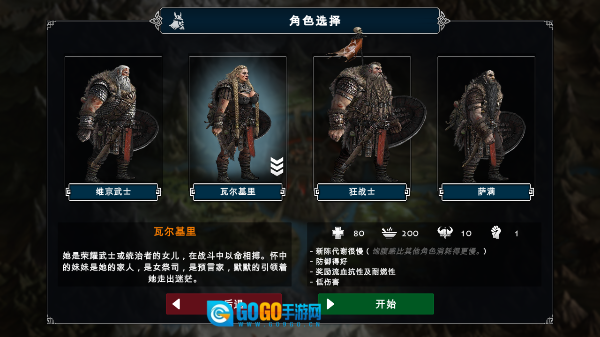 3、游戏共向玩家提供维京武士、瓦尔基里、狂战士、萨满这四个角色,每个角色都具备独特的属性面板与特性。