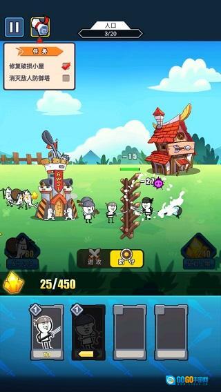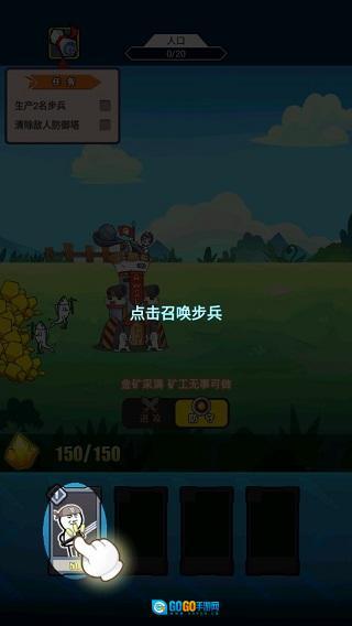 2.游戏中依靠咸鱼矿工采集矿石,用以招募士兵、部署单位。玩法类似经典策略塔防,但整体风格诙谐幽默,融合了大量网络流行表情与趣味画风,体验轻松又有策略性。点击界面即可召唤步兵开始作战。