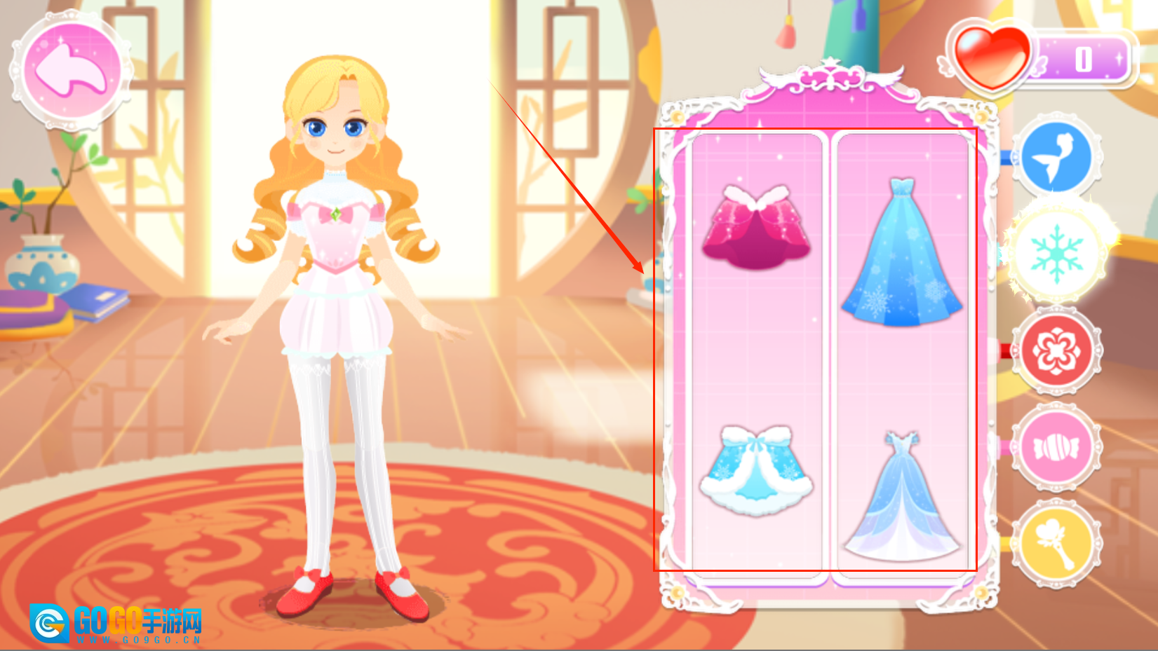 2、这里有多种玩法,点击衣柜可给公主换装,点击梳妆柜可给公主化妆。