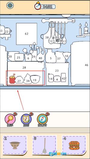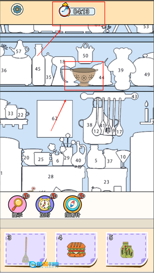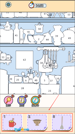 1、进入游戏后可以看到下方排列的各种物品,上方是空白轮廓图,根据编号提示将对应物品拖动到正确位置即可完成填充。