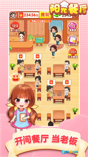 《阳光餐厅》是一款以餐厅经营为核心玩法的模拟养成游戏。在游戏里,玩家将化身为餐厅店主,从经营一家小小的餐馆起步,一步步朝着更大的目标迈进。为了吸引更多顾客,玩家需要精心规划菜单、用心装修店面、努力提升服务质量。同时,还得亲自下厨烹饪,完成顾客的订单任务。此外,游戏中会有各种各样的挑战和活动等待玩家去应对,通过不断克服困难、参与活动,玩家可以逐步提升餐厅的等级和知名度,最终打造出属于自己的美食帝国。