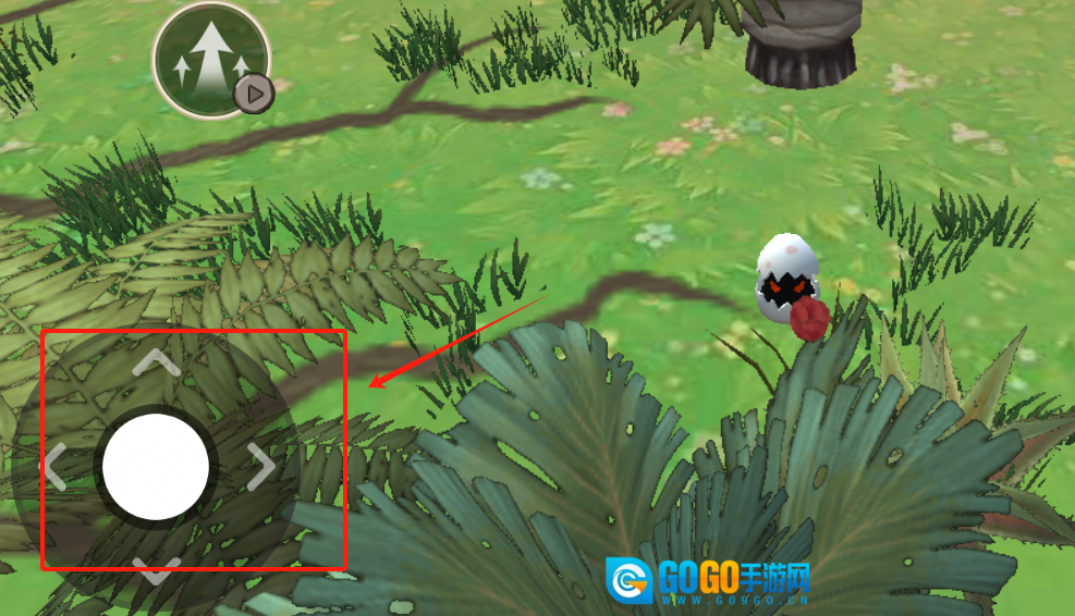 3、通过虚拟摇杆控制红眼白蛋移动,探索绿植场景寻找可吞噬目标。