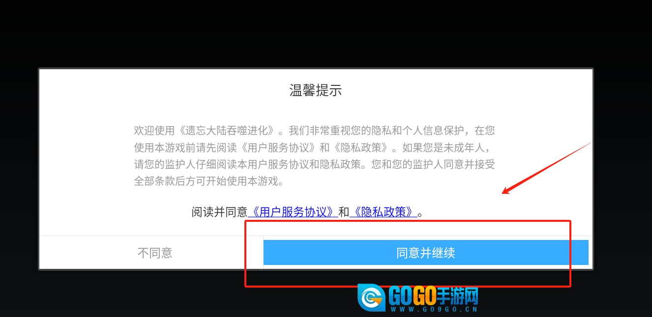 1、点击同意并继续按钮跳过协议提示框,进入游戏主界面开始新冒险。