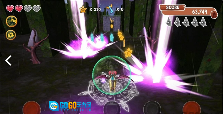 3、站在圆形图案上会被绿色光圈保护,此时可以安全恢复状态或准备战斗。前方的黄色星星与蓝色晶体均为可收集物品,靠近后会自动拾取并增加分数。